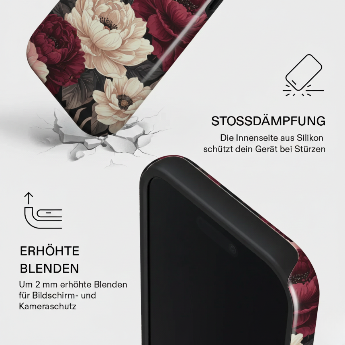 Erhöhte Blenden: Der Rand der Hülle ist um 2 mm erhöht. Dies dient dem Schutz des Displays und der Kamera-Linsen, damit diese nicht direkt auf Oberflächen aufliegen.